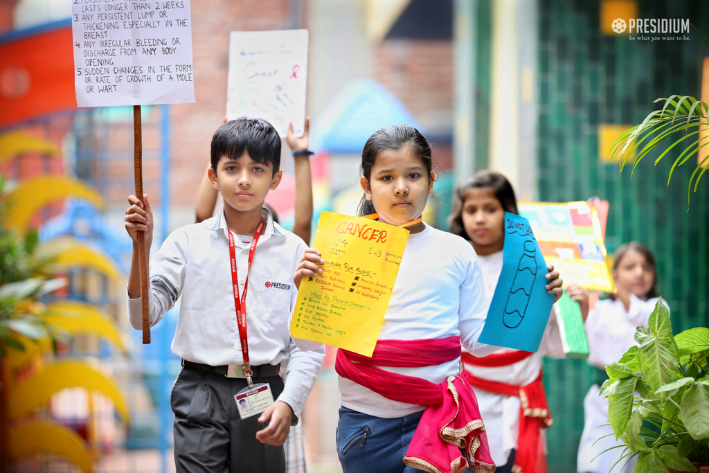 Presidians of grade 3 organised a rally on National Cancer Awareness Day to raise awareness about cancer. The objective was to encourage its prevention, detection, and early treatment. The students enthusiastically participated in the rally carrying placards in their hands and giving knowledge about the rising cases of cancer due to tobacco use, sunburns, obesity, excessive intake of alcohol and various other things. Students also emphasised that early detection, screening and diagnosis will significantly improve survival rates. Overall it was a great step towards learning for young minds.